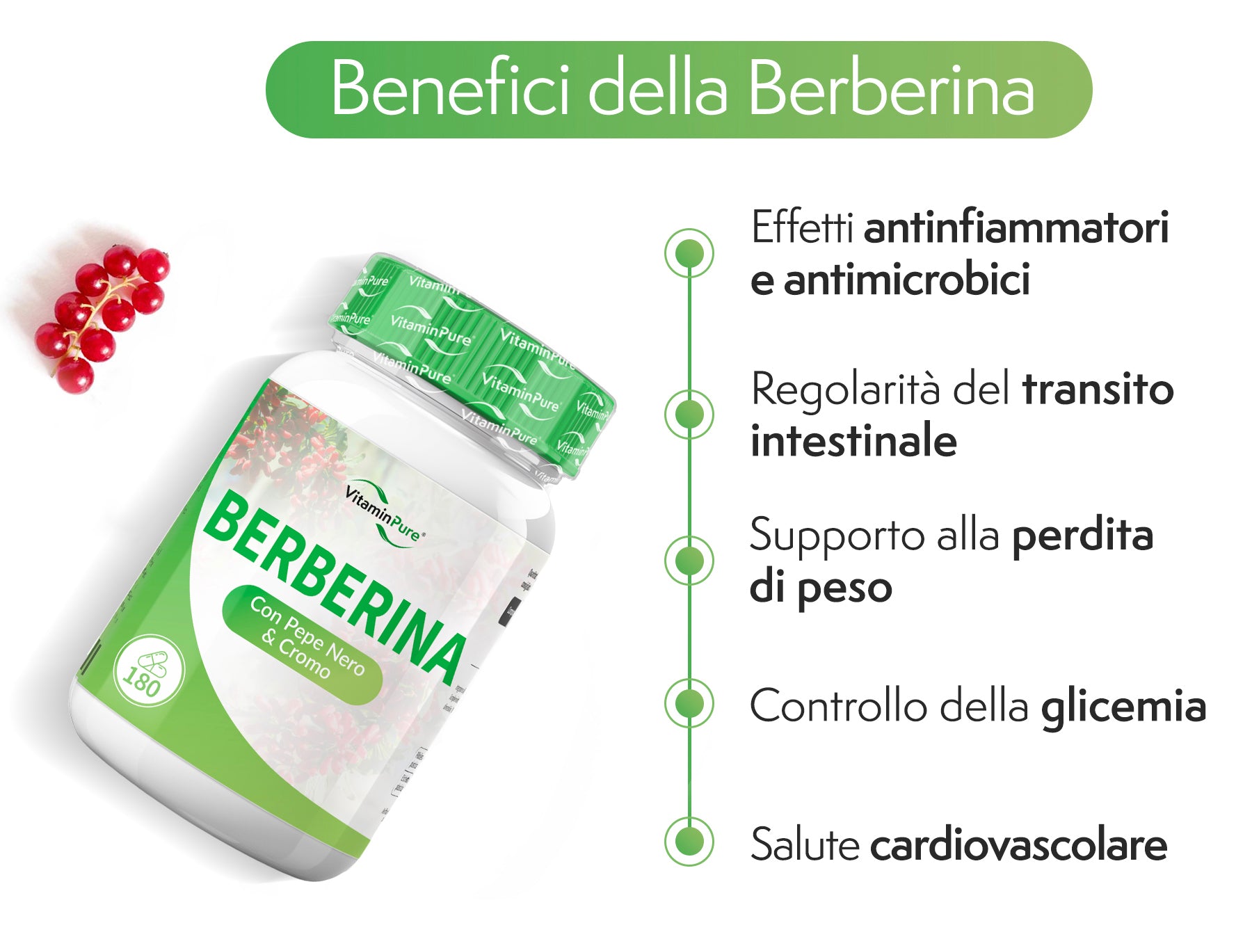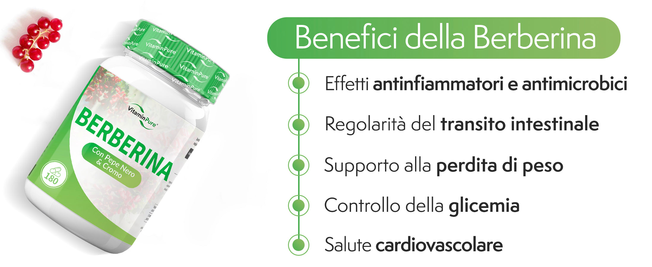- BENEFICI DELLA BERBERINA : L’integratore alimentare a base di berberina ti offre diversi benefici per la salute, in particolare nel supporto al controllo del peso e al miglioramento della sensibilità insulinica. La berberina HCl 500 mg per dimagrire di VitaminPure è particolarmente apprezzata per la sua capacità di regolare i livelli di glucosio nel sangue, favorendo la perdita di peso e riducendo l’accumulo di grasso corporeo. Inoltre, la berberine può contribuire al miglioramento del profilo lipidico, riducendo il colesterolo cattivo (LDL) e i trigliceridi, con effetti positivi sulla salute cardiovascolare.