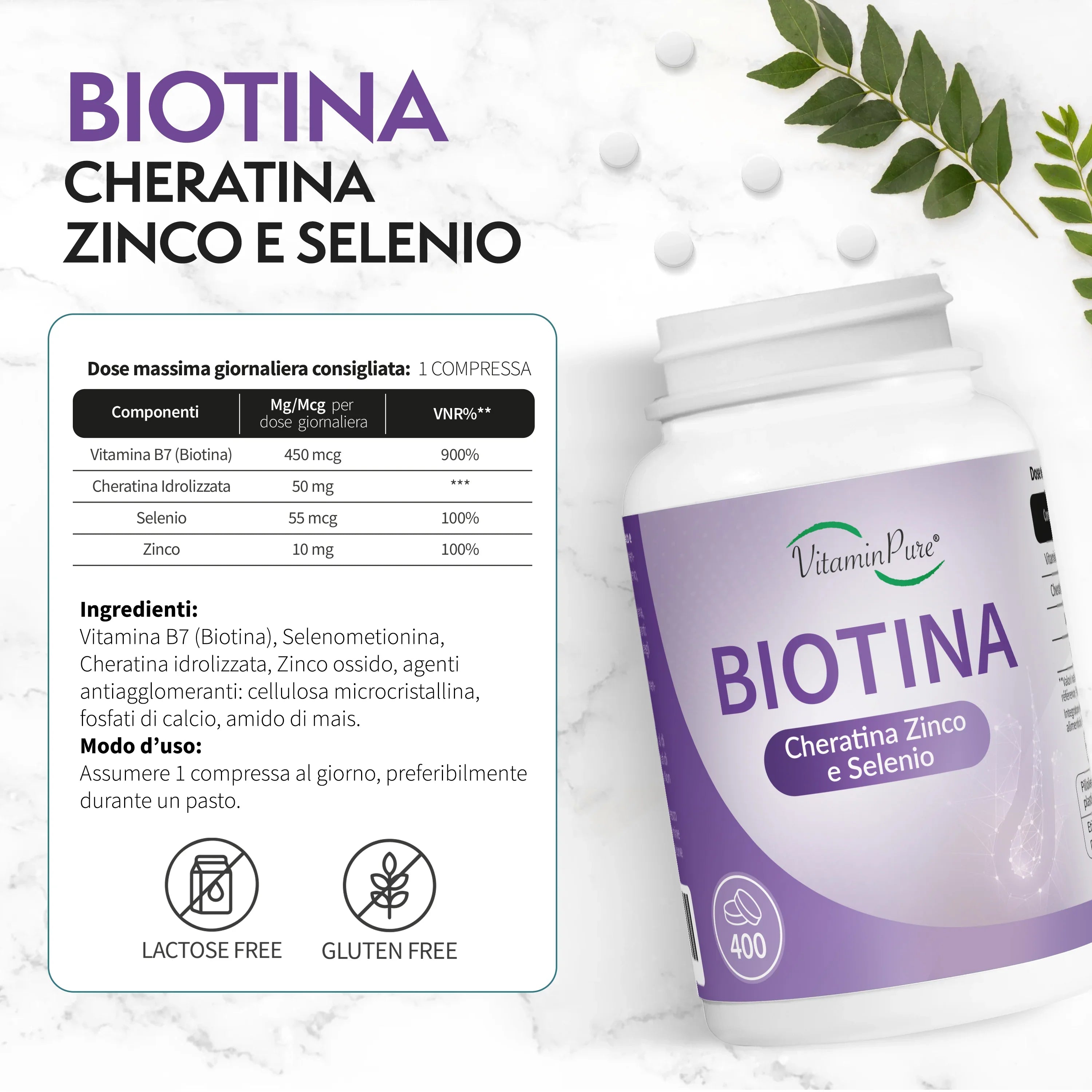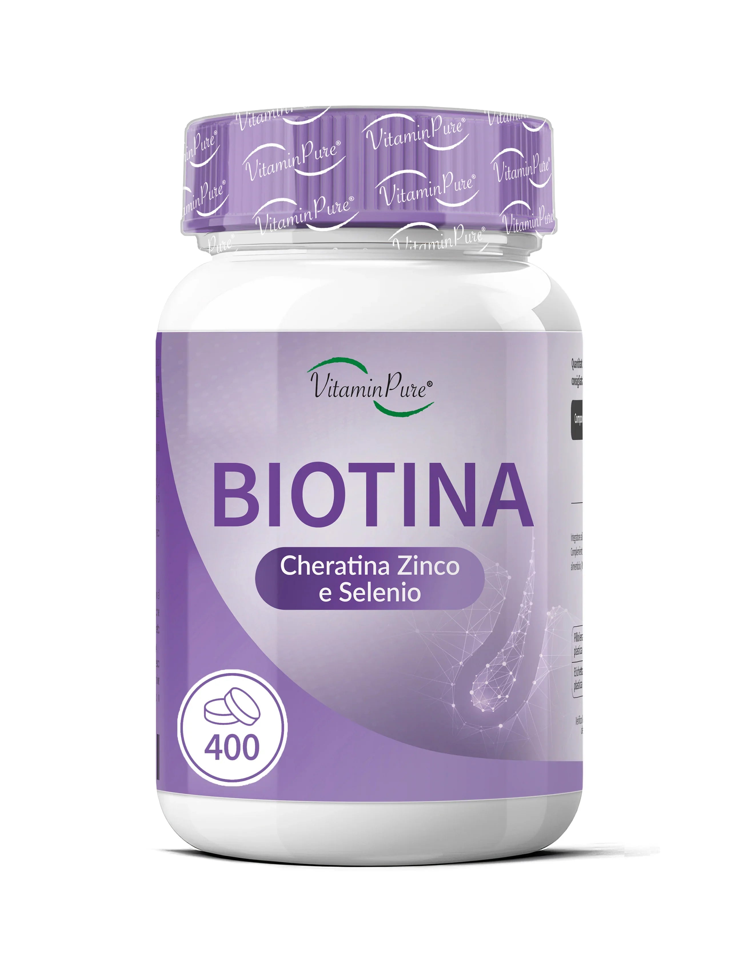 La biotina VitaminPure aiuta a migliorare la salute dei capelli promuovendo la produzione di cheratina, la proteina principale dei capelli. Può contribuire a rafforzare i capelli, ridurre la rottura e favorire una crescita più sana.