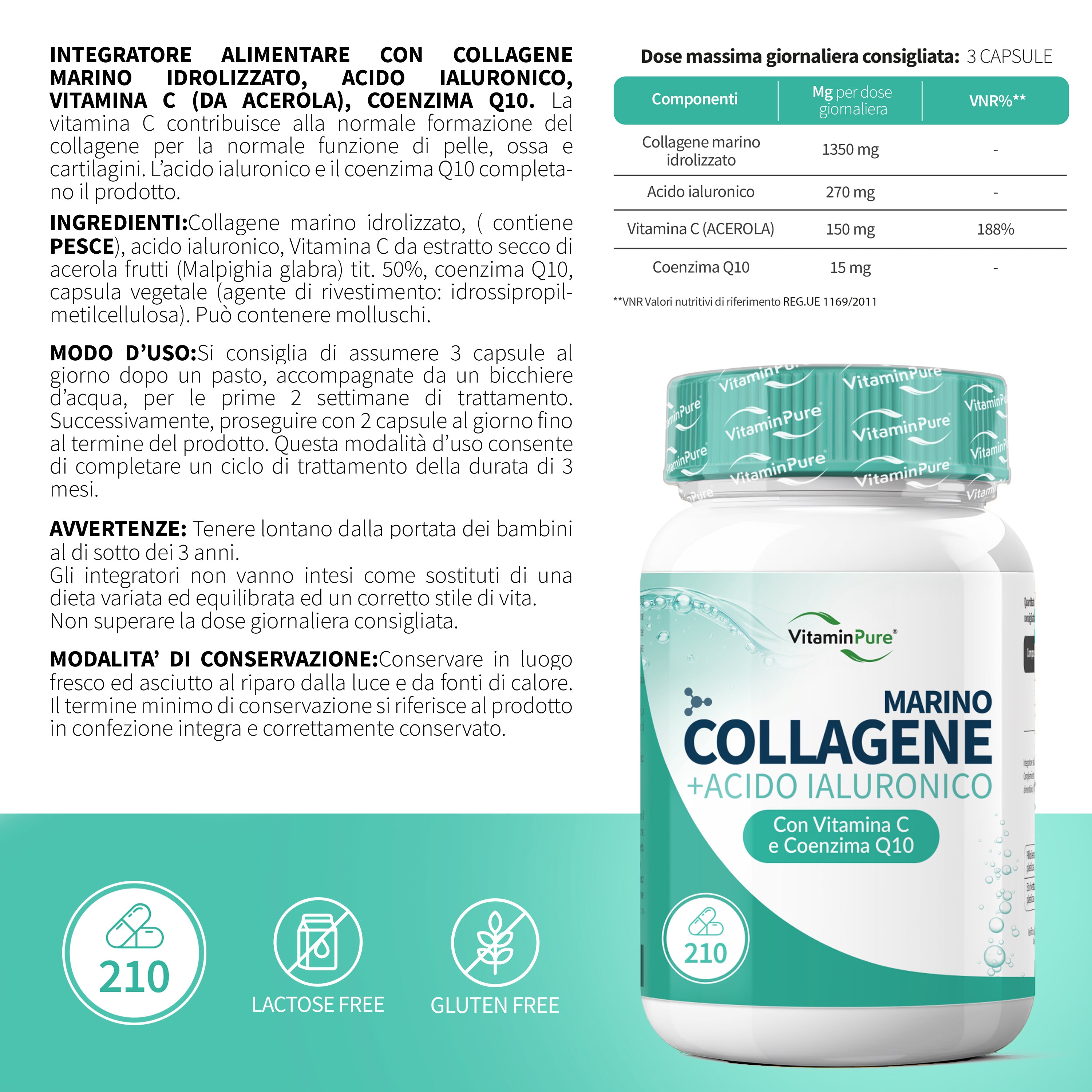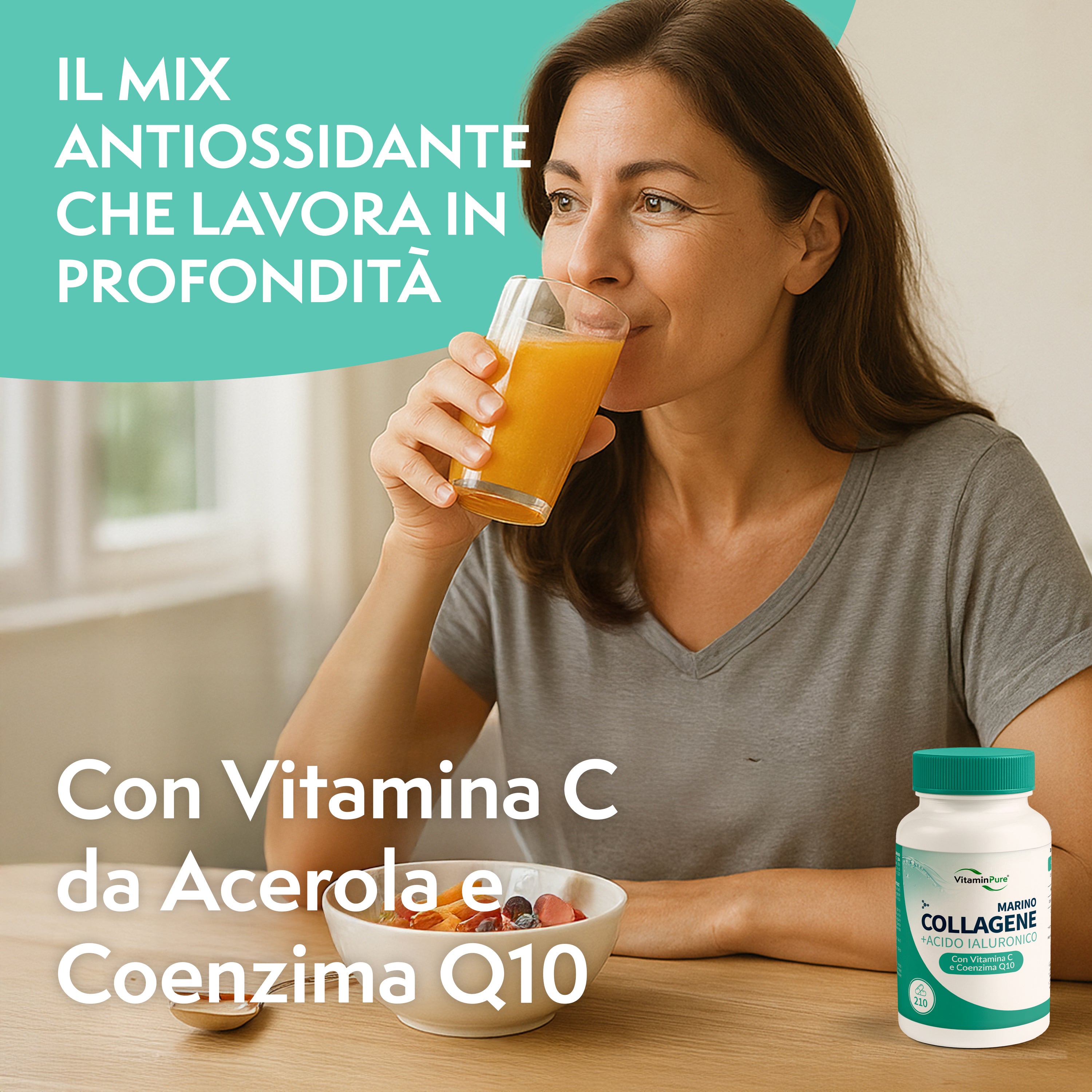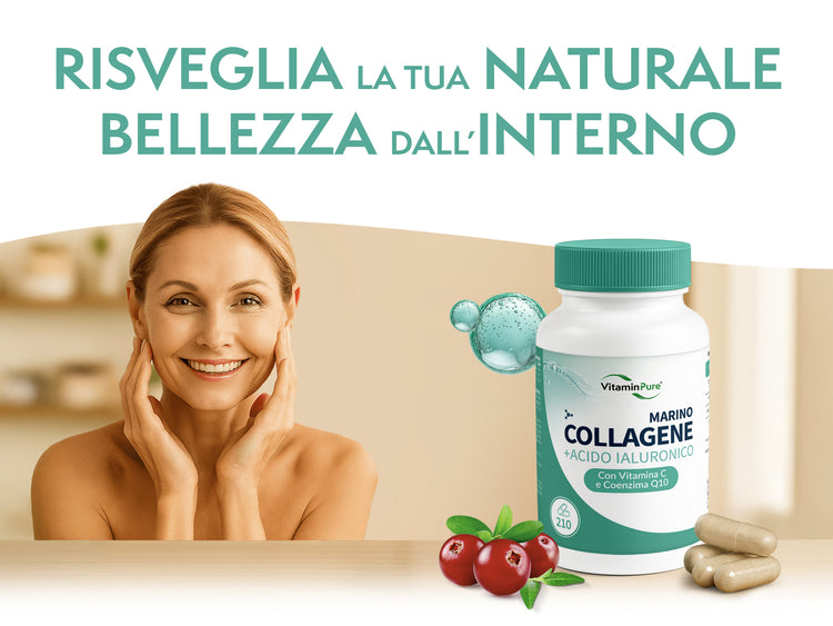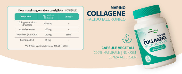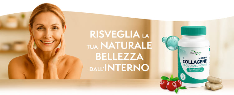 Il collagene marino aiuta pelle, articolazioni, capelli e unghie. Insieme a vitamina C, acido ialuronico e coenzima Q10, ha un effetto anti-age, migliora l’elasticità e favorisce l’idratazione cutanea.
