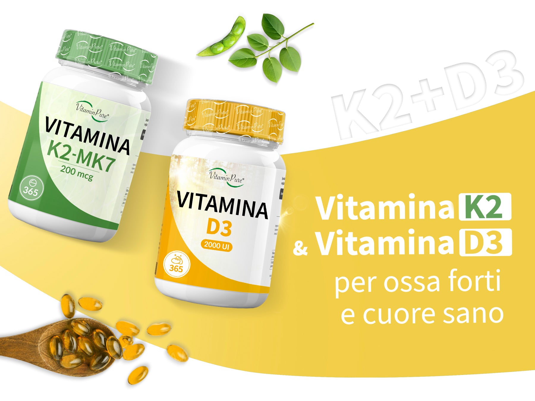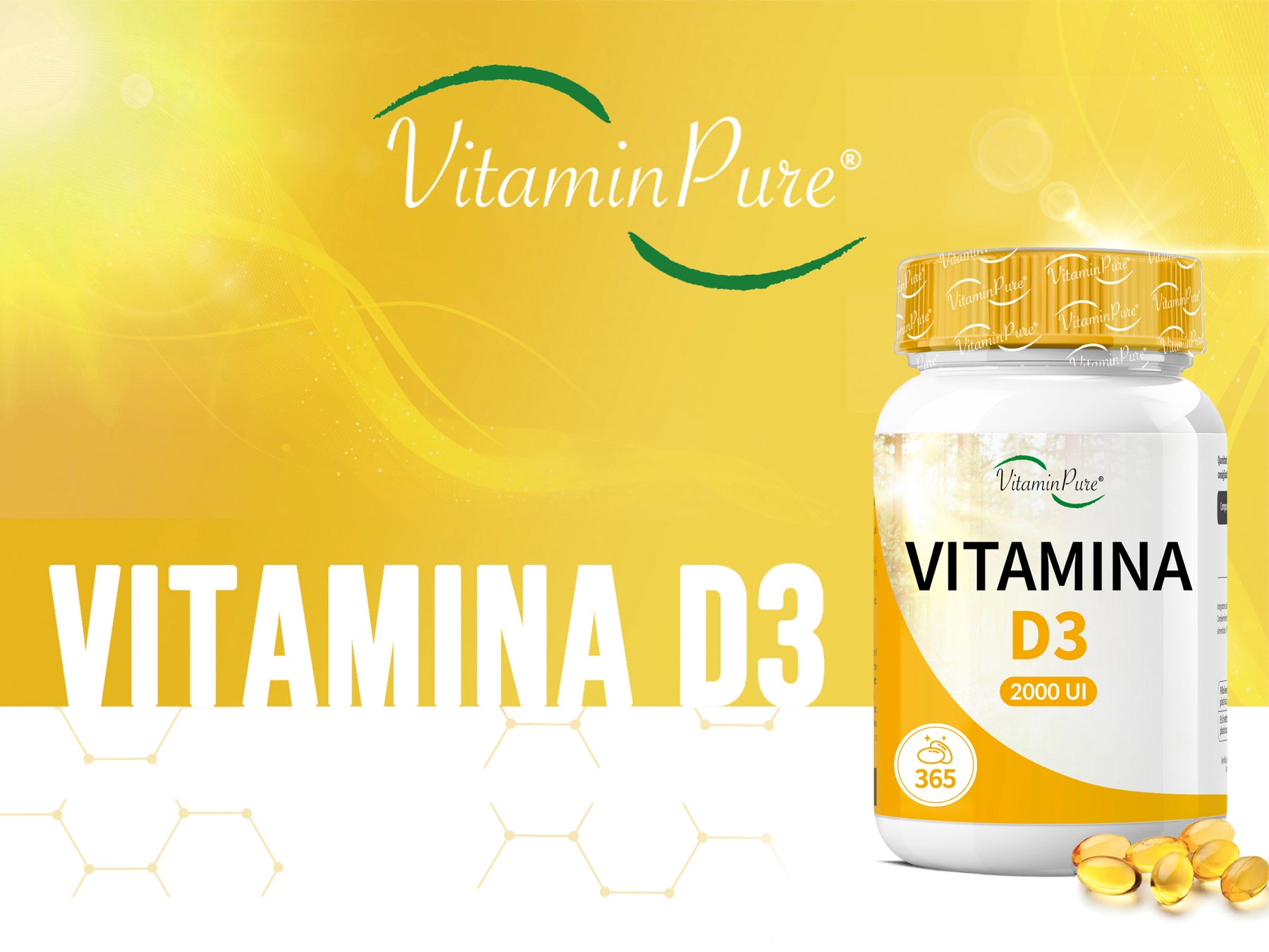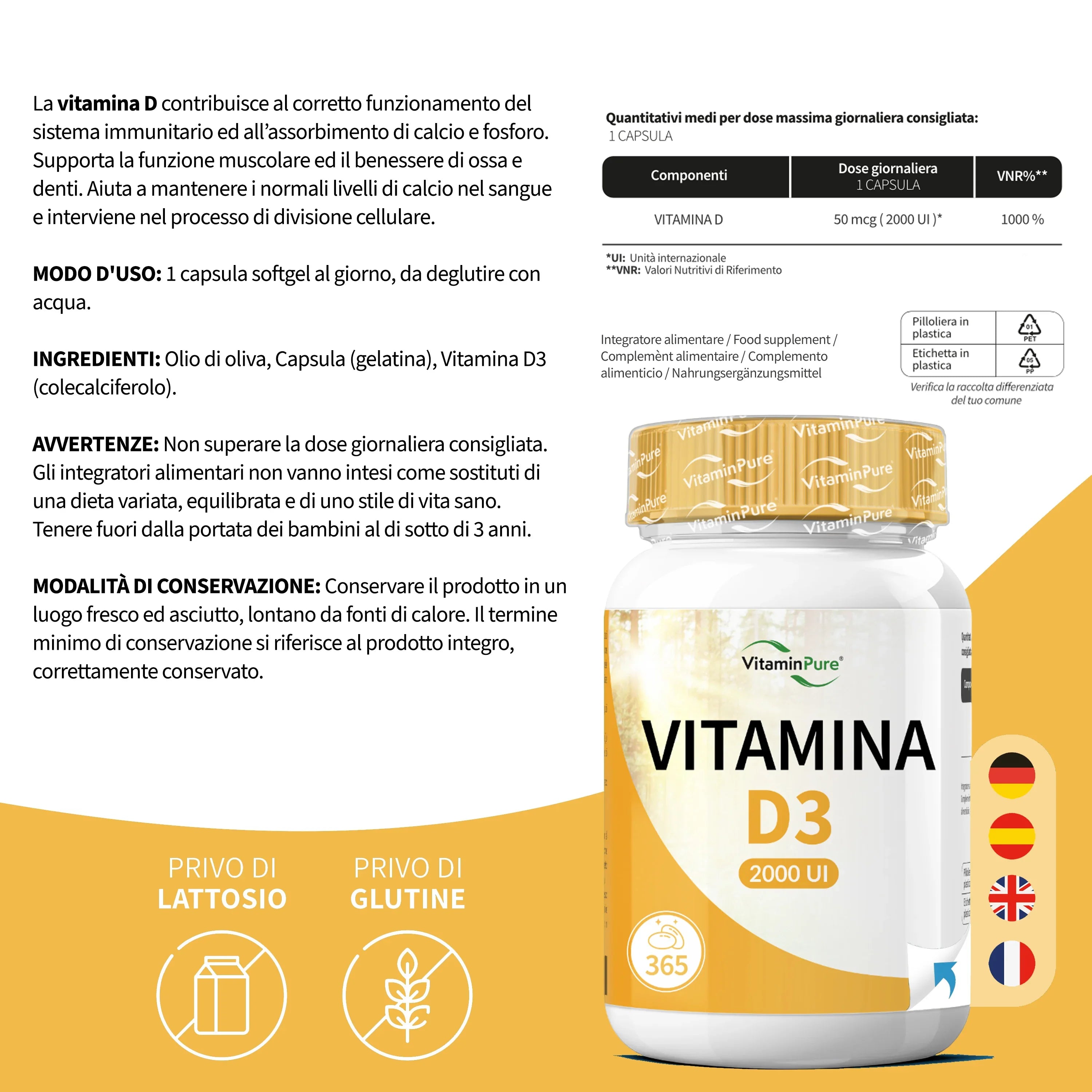 - 12 MESI DI COPERTURA : Con l'integratore vitamina D3 di VitaminPure avrai una scorta di ben 365 softgel vitamina D. Una softgel di vitamin D3 al giorno basterà per coprire il tuo fabbisogno giornaliero ideale per un anno intero. Non contiene OGM e additivi artificiali, privo naturalmente di glutine e lattosio.