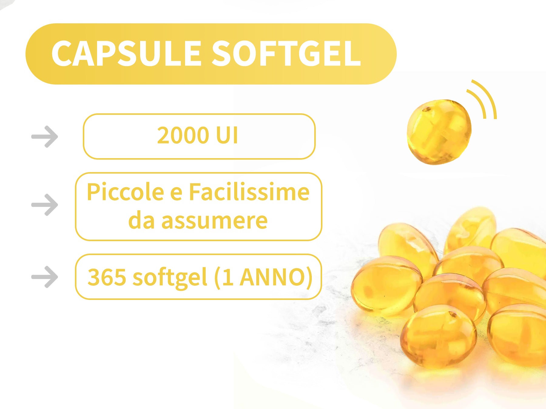 - VITAMINA D3 SOFTGEL : Piccole capsule softgel facilissime da deglutire. Ideate per sostituire le compresse vitamina D spesso difficili da assumere.